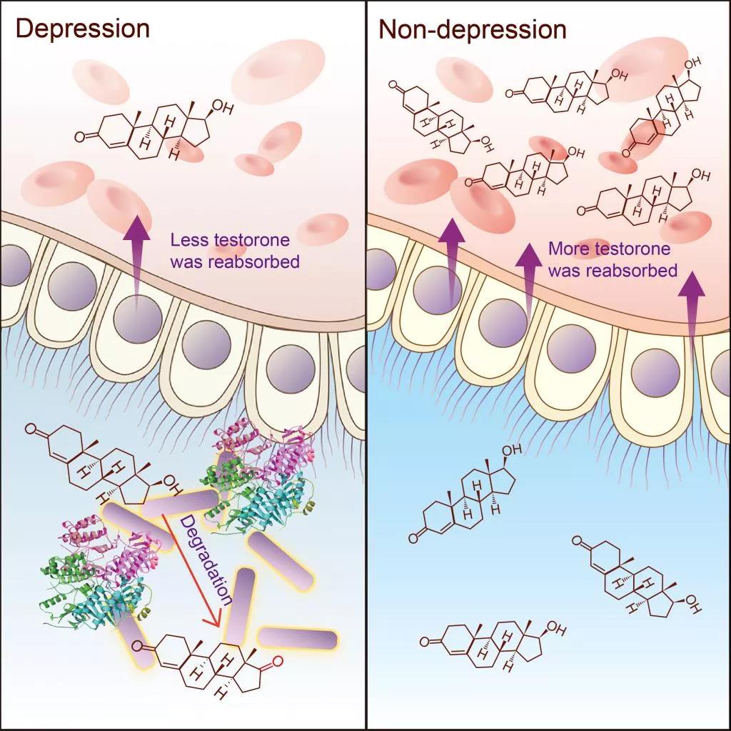 睾酮是一种神经类固醇激素,它的降低是男性抑郁症的病因之一。正常情况下,睾酮被肝脏代谢并通过胆汁排入肠道后再次被重吸收入血,形成肝肠循环。人体肠道中的微生物具有丰富的功能,科学家们也因此把它们称之为身体“器官”之一。睾酮的肝肠循环过程是否能被肠道菌群影响?